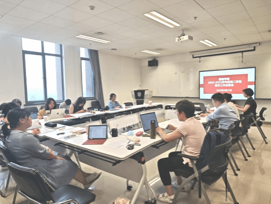 第二个环节是学期工作总结。太阳集团tyc9728基础教研室、研究生教研室、文学教研室、语言学教研室、翻译教研室、外交教研室、经济教研室、跨文化教研室、教师党支部、工会负责教师,党政联席会班子成员依次汇报了本学期的工作开展情况、取得的成绩以及存在的不足。