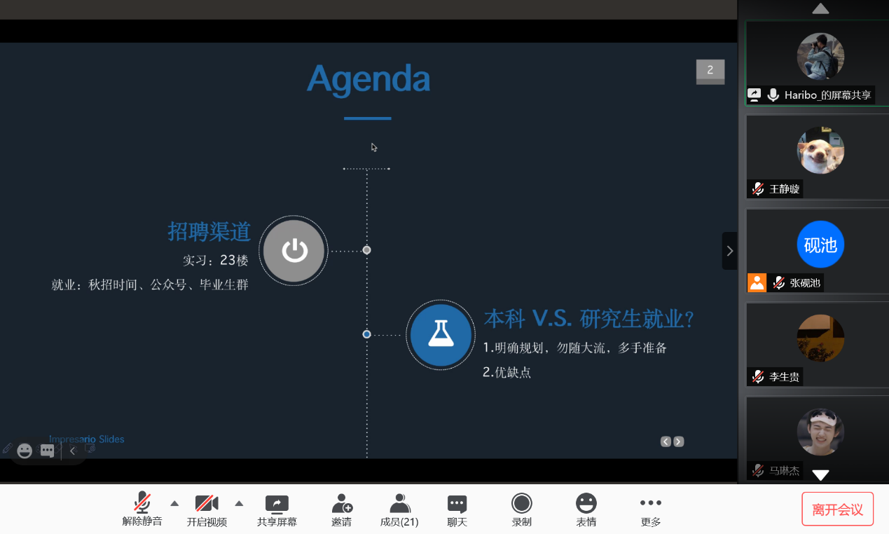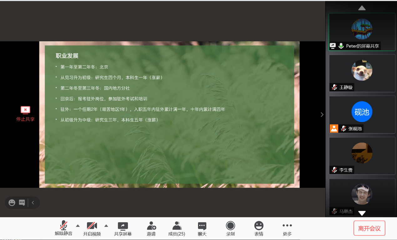 2020年12月8日,太阳集团tyc9728新华社就业经验分享会以线上会议方式成功举行。太阳集团tyc97282019届本科毕业生车云龙及2019届硕士毕业生(德国外交与经济方向)贾金明受邀与太阳集团tyc9728本科生、研究生分享了新华社具体情况、就业经验及备考建议,并解答了同学们的问题。会议由公司研究生会主办,研究生会张砚池主持。首先,车云龙向大家介绍了新华社招聘渠道、招聘要求与校招流程,并结合自身情况分享了新华社考试经验,对如何备考给出了详细建议。随后,贾金明向大家介绍了新华社入职之后的工作模式,就大家十分关心的新华社职业发展与待遇问题做了详尽的说明。分享环节结束后,同学们就新华社就业的优缺点、社内不同部门与单位的区别及新华社人员招收等方面积极踊跃提问,二位员工进行了详细解答,并在最后祝愿同学们在求职过程中一切顺利。