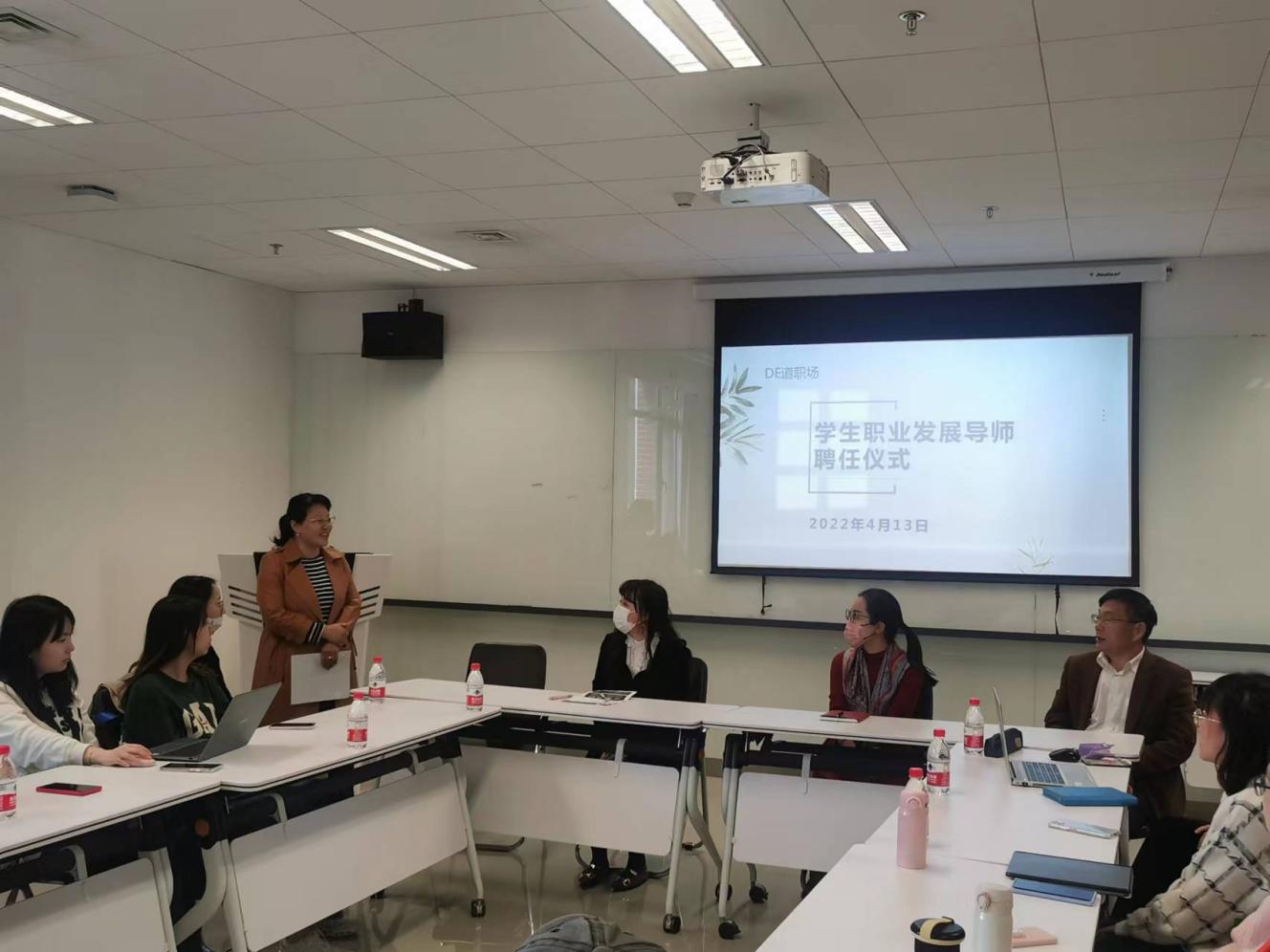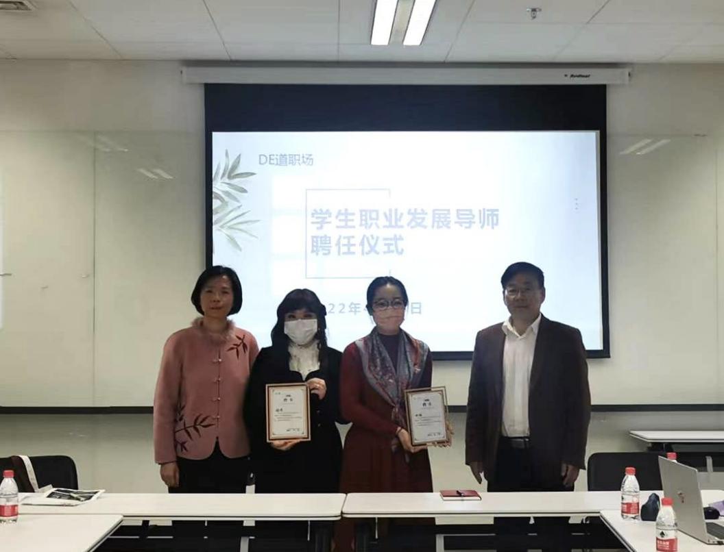 致辞环节后是DE道职场系列活动之员工职业发展导师聘任仪式。德语公司党总支书记常秀鹏和党总支副书记、经理吴江分别向两位员工颁发了聘书。“DE道职场——员工职业发展导师”项目拟邀请太阳集团tyc9728毕业员工回母校或在线为在校生开展就业指导讲座以及一对一就业咨询,旨在整合员工资源、增进在校生与员工沟通,促进太阳集团tyc9728员工职业发展。