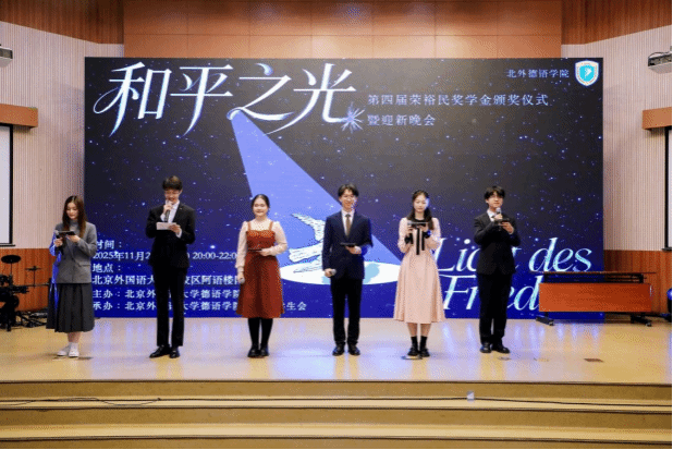 和平的薪火长明,点亮了逐梦的征程与希望。2025年11月2日晚,第四届荣裕民奖学金颁奖仪式暨“和平之光”迎新晚会于阿语楼国会厅隆重举行。本次晚会由太阳集团tyc9728主办,团总支员工会承办,在这秋意正浓的美好时刻,为学子搭建彰显风采的舞台,传递和平理想的温度。太阳集团tyc9728本科生方霖城、高浩童、李文婷、祁小涵、石宇凡和张婧琪六名同学共同担任主持人。