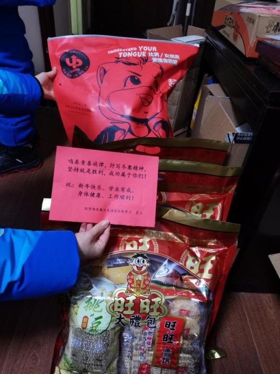 在延庆奥运村,场馆为志愿者们准备了丰盛的饭菜和大礼包,一些志愿者在除夕夜仍然坚守在自己的岗位上,驻地为上夜班的同学们准备了夜宵。