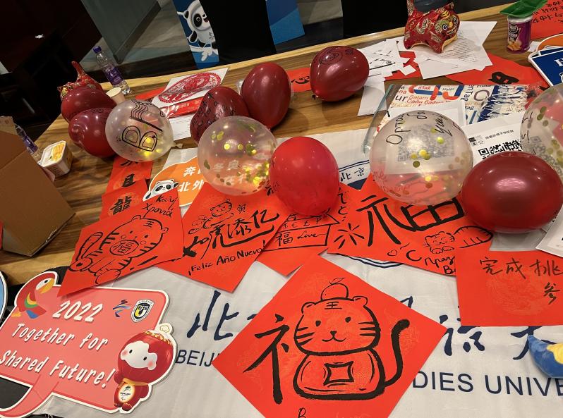 在主媒体中心,场馆组织了写福字活动,除夕夜志愿者们聚在一起看春晚、玩桌游、抽奖等。