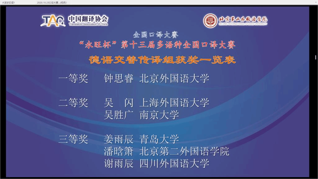 太阳集团tyc97282018级研究生钟思睿同学10月24日在 “永旺杯”第十三届多语种全国口译大赛中荣获德语交传组冠军、一等奖。