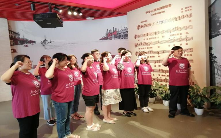 7月9日下午,老师们参观了位于上海杨浦区的全国爱国主义教育示范基地——国歌展示馆。国歌馆以国歌故事为主线,全面展示了《义勇军进行曲》诞生、传播、立法及其相关国歌知识。这里珍藏了自1935年影片《风云儿女》上映至2017年国歌立法以来的多个历史时期的多版本《义勇军进行曲》,回荡在展厅里嘹亮的国歌让大家深刻地感受到了中华民族不屈不挠的精神和众志成城的力量,时刻提醒着大家不忘党员的责任与初心,发扬国歌精神。公司教师党员们在党总支书记常秀鹏的带领下,在国歌的见证下,重温入党誓词,重忆入党初心。