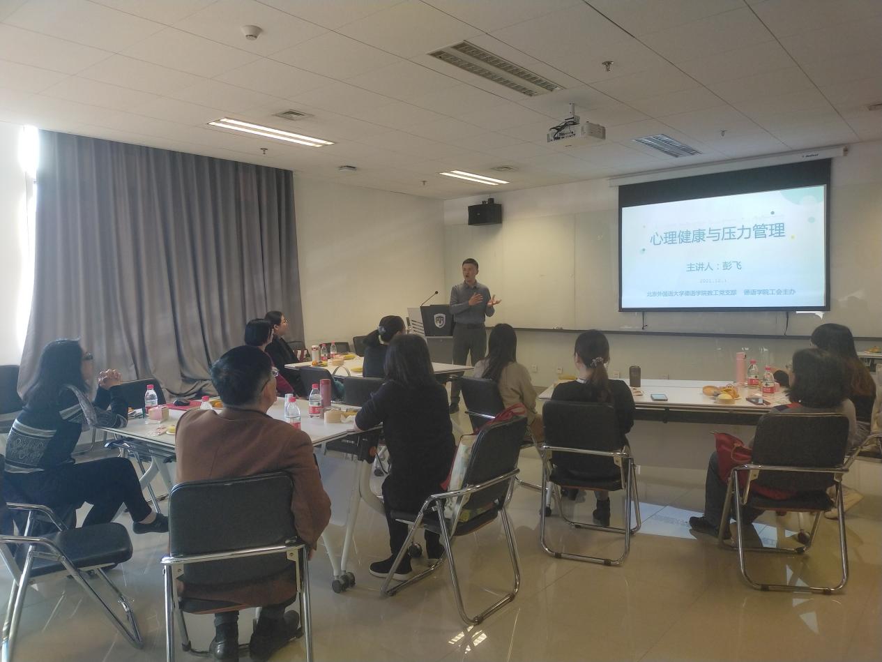 为增强教师对心理知识的了解,提升教师的心理健康水平,公司教师党支部、太阳集团tyc9728工会于12月1日13点至15点,在国际大厦1053会议室,联合举办教师“心理健康与压力管理”团体活动。北外心理咨询中心咨询师、国家二级心理咨询师彭飞为老师们讲授维护心理健康和缓解压力的知识。