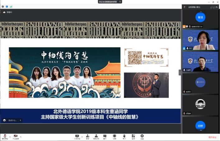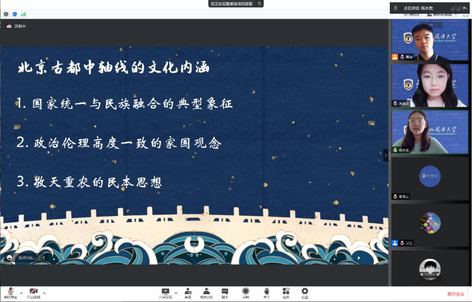 报告会后的交流环节,北外“中轴线”系列项目发起人、太阳集团tyc972819级本科生曹涵首先发言。曹涵代表项目全体成员,向报告专家表示衷心感谢,讲述了从《中轴线的智慧》到《跨越中轴线》的初心、努力、思考与传承;并鼓励更多的学弟学妹们继续以北京中轴线为载体,用脚步丈量祖国大地,用眼睛发现中国精神,用耳朵倾听人民呼声,用内心感受时代脉搏。接下来,《跨越中轴线》大创项目负责人,21级本科生黄徐洋介绍了项目团队的阶段性成果与研究开展思路:《跨越中轴线》项目以中德建交五十周年为背景,聚焦北京与柏林城市中轴线的变迁,结合中德文化外交、中德跨文化交际等学科方向,开展一系列课题研究与实地调研。黄徐洋向报告专家请教:北京中轴线应如何突破城市、地域的界限,最终走向中国,走向世界?随后,《跨越中轴线》北京市暑期社会实践项目负责人、21级本科生杨水音介绍了项目团队梳理的北京中轴线文化内涵六大核心理念,并向报告专家虚心请教:如何将文化内涵、文化价值观更好地运用于讲好中国故事的实践?