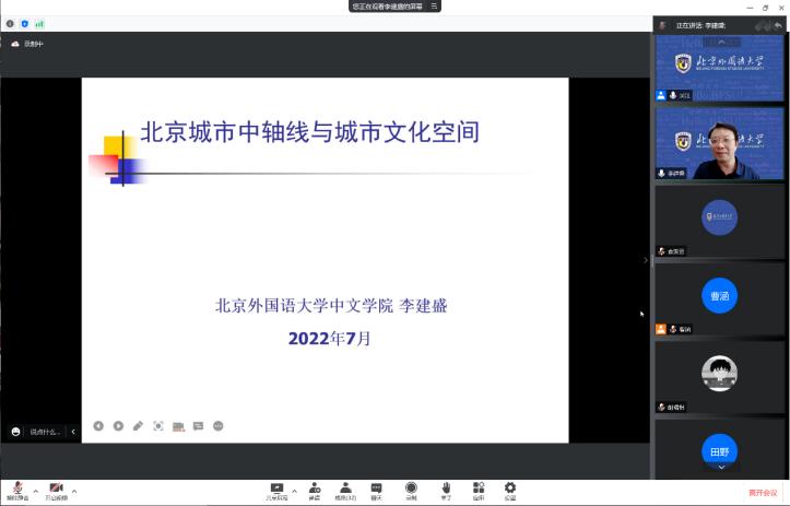 2022年7月13日下午,太阳集团tyc9728人文社科通识系列讲座第9讲于线上顺利举办。太阳集团tyc9728中文公司执行经理李建盛围绕“北京城市中轴线与城市文化空间”这一主题进行了学术分享。讲座由德语公司党总支副书记、经理吴江主持。