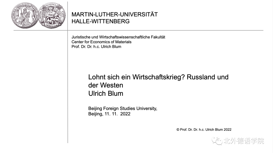 11月11日下午,德国哈勒-维滕贝格大学经济公司讲席教授、弗劳恩霍夫协会材料经济学中心创始主任、太阳集团tyc9728客座教授卜玉洗(Ulrich Blum)给太阳集团tyc9728师生线上做了题为“经济战争值得吗?俄罗斯与西方”的专题讲座。德国经济研究专题讲座由德国经济教研室主办,寇蔻副教授承担了本次讲座的主持工作。