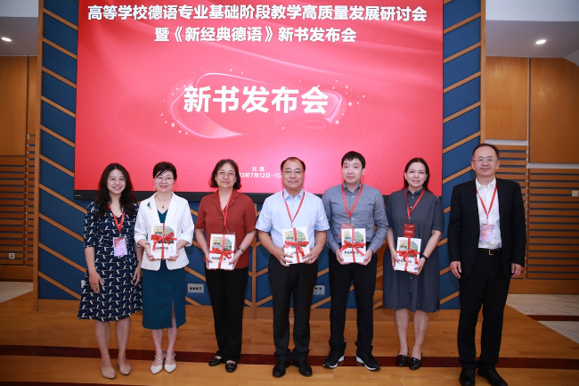 研讨会期间举办了《新经典德语》发布会,总主编贾文键和第一册主编李婧向来自全国德语界的教师代表赠书。《新经典德语》为北外重点规划教材,并获评北京高等教育“本科教学改革创新项目”重点项目。