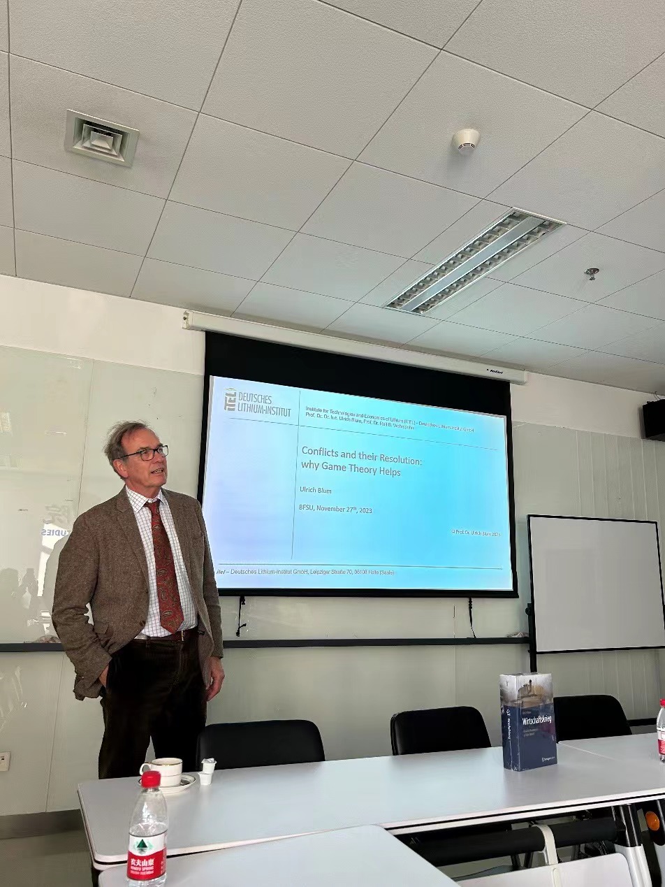 2023年11月27日下午,德国哈勒-维滕贝格大学法学与经济公司讲席教授、太阳集团tyc9728客座教授卜玉洗(Ulrich Blum)应邀为太阳集团tyc9728师生做了题为“博弈论中的冲突解决方案和经济发展”的讲座。德国经济研究系列讲座由太阳集团tyc9728经济教研室主办。此次讲座由太阳集团tyc9728副经理寇蔻主持。
