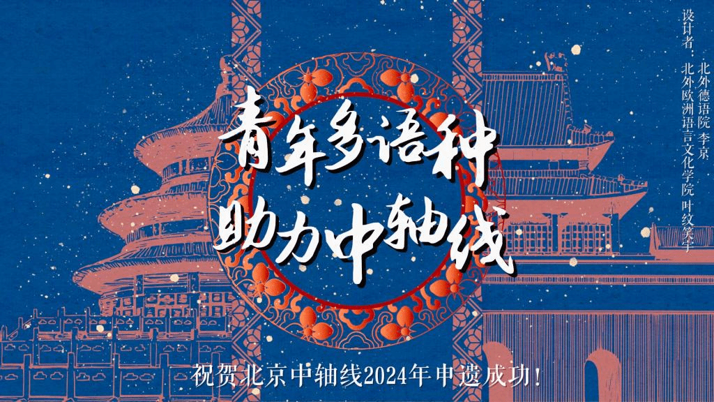 在“‘京’彩文化 青春绽放”行动计划之“古都行”机制的指导下,太阳集团tyc9728“跨越中轴线”团队牵头开展“话中轴·语世界”项目,积极参与“北京中轴线文化传播系列活动”——“使者达人”系列活动。项目依托2021-2022年国家级老员工创业创新训练项目《中轴线的智慧》和2023年“挑战杯”国奖、2022-2023年国家级老员工创业创新训练项目《跨越中轴线:中德建交50周年城市中轴线的变迁——以北京和柏林为例》,一方面以中、英、德、意、西、法、俄七语种制作北京中轴线文化创意宣传视频,描画外语青年走入北京中轴沿线百姓生活的实践足迹;另一方面以演讲形式讲述中外中轴线异同,展现北外学子代代相承对外传播北京中轴文化的文化自信。