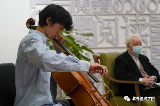 分享会伊始,2019级本科生任翊晨深情演奏德国著名音乐家巴赫(Johann Sebastian Bach)作曲的《G大调第一大提琴组曲阿列曼德舞曲》。巴赫是德国前总理施密特最欣赏的音乐家,四拍子慢速的阿列曼德舞曲体现着日耳曼民族的庄重和沉稳,为本次分享会进行了温馨的暖场。