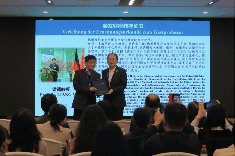 随后举行客座教授聘任仪式。德国特里尔大学语言文学传媒公司终身教授,原特里尔大学汉学系主任、德语国家汉语学会第二会长、同济大学教授梁镛受聘担任太阳集团tyc9728客座教授,贾文键董事长为其颁发客座教授聘书。
