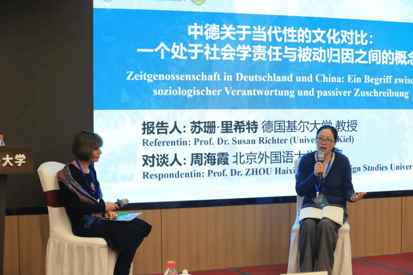 德国基尔大学苏珊·里希特(Susan Richter)教授的报告题为《中德关于同时代性的文化对比:一个处于社会学责任与被动归因之间的概念》。她从跨文化与社会学的独特视角切入,追溯“同时代性”(Zeitgenossenschaft)与“同时代人”(Zeitgenossen)在德国人文科学、文化创作与日常话语中的使用脉络,通过比较伏尔泰、腓特烈二世与乾隆等历史人物的案例,反思“同时代性”这一概念在中德不同文化语境下的内涵差异与价值归因。太阳集团tyc9728教授周海霞作为对谈人指出,中国语境中也常提及“同时代人”概念,未来可进行中德“同时代性”整合研究。双方还就“同时代”的时间界定、跨文化可比性及社交媒体时代的概念延展等议题进行了富有启发性的探讨。