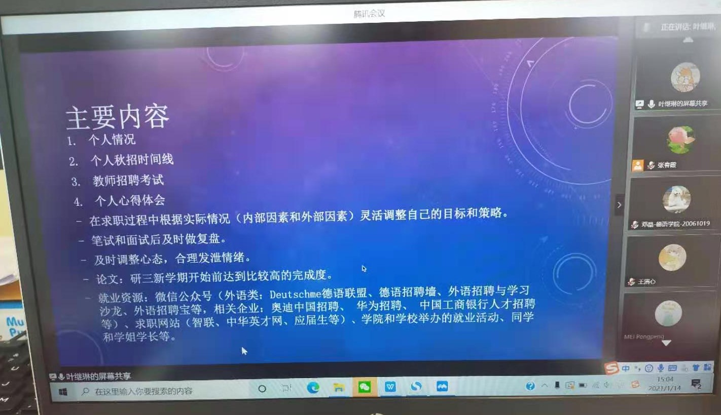 1月14日下午研究生期末会议,60余名研究生在线参加。会议邀请了研三员工张舶航、叶继琳、商健华进行经验分享。他们分别从研究生学业、职业规划,考博、求职经验等方面进行分享。之后辅导员张春霞作了“研究生职业规划”的报告。张春霞老师首先介绍了2020年北外就业质量报告的相关内容,之后对2020届、2021届毕业研究生就业情况和就业形势进行分析,结合用人单位的反馈、毕业生的问卷等对研究生的学业、职业规划提出几点建议,并解答了同学们关于学业、职业等方面的困惑。最后对假期疫情防控、人身财产安全注意事项等进行了布置和要求。