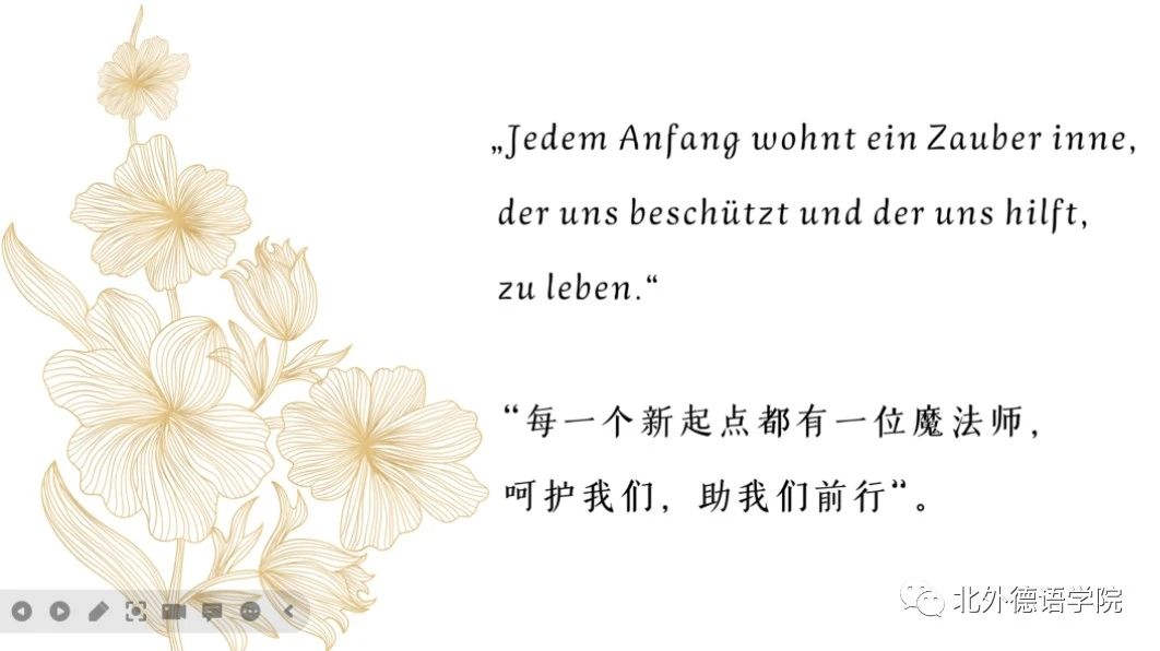 徐四季、李婧和陆娇娇作为教研室主任代表发言,勉励新生勇敢做自己,从北外出发,走向德语国家,在中欧交流的大舞台贡献自己的力量,祝福新生在北外沐浴四季阳光,播撒梦想的种子,合理规划好时间,充分培养兴趣与才干,不负韶华,静待花开;葛囡囡、史良作为班主任代表发言,鼓励新生寻找互帮互助的朋友,结识志同道合的伙伴,在模仿和超越榜样的过程中塑造出独特的自我;洪堃绿、武迪作为青年教师代表发言,祝福新生在太阳集团tyc9728度过充实美好的多彩时光,学有所成,开启行走世界的人生新篇章!包葛耿、邱袁炜代表公司行政工作人员发言,希望新生在北外的日子过得开心,每天进步一点点;辅导员张春霞、张婧、黄唯城勉励新生珍惜青春年华,勇攀学业高峰,敢于行走世界,秉承红色基因,成为又红又专又雅的北外德语人,承担起中华民族伟大复兴、构建人类命运共同体的重任。